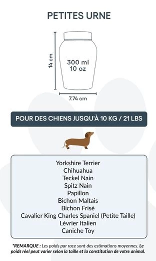 Ideal for pet cremation and dog ashes, this memorial urn is available in two sizes to accommodate small to large-sized dogs. With a secure closure and custom design, it serves as both a protective casket and a comforting symbol of your pet’s place in your heart.