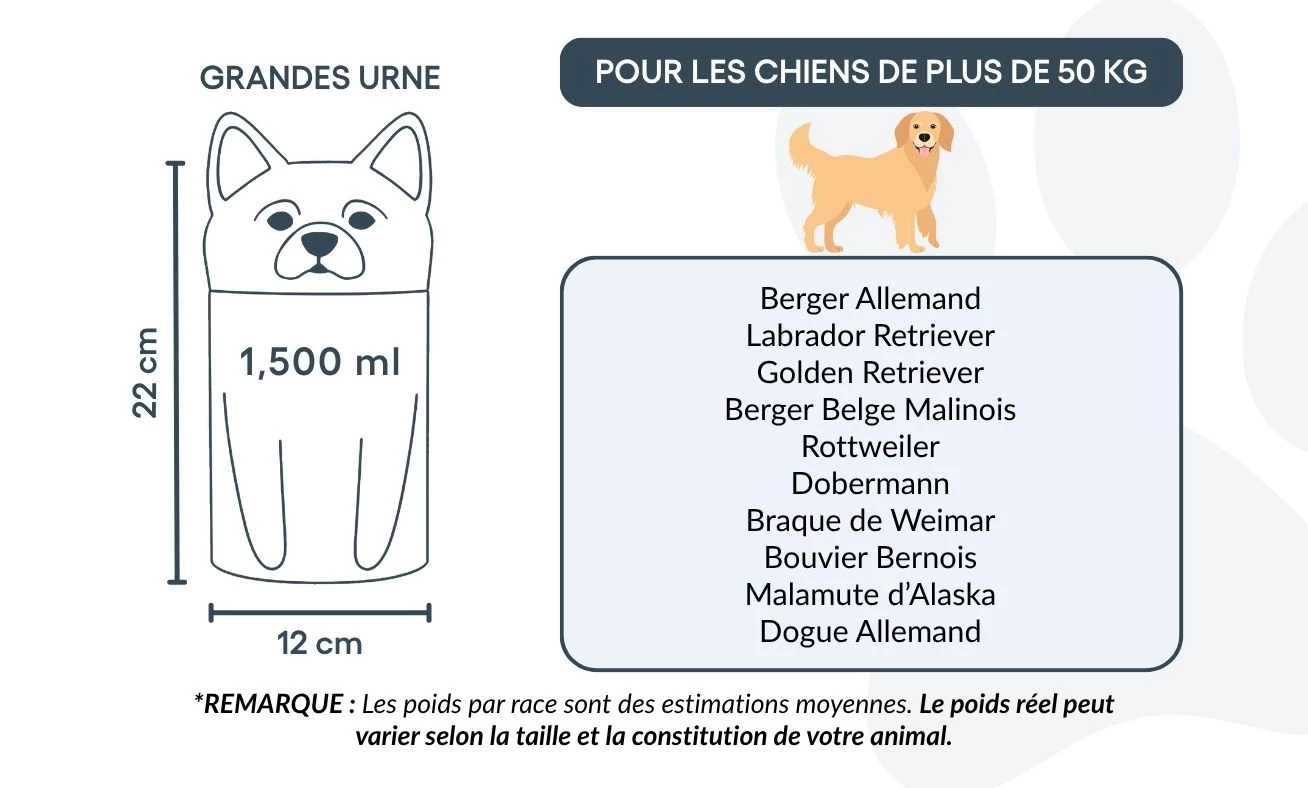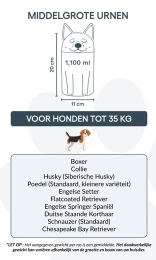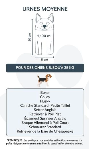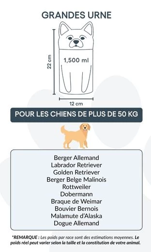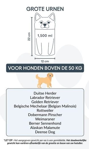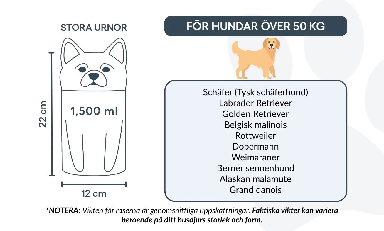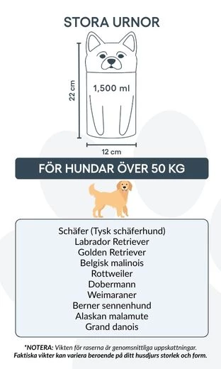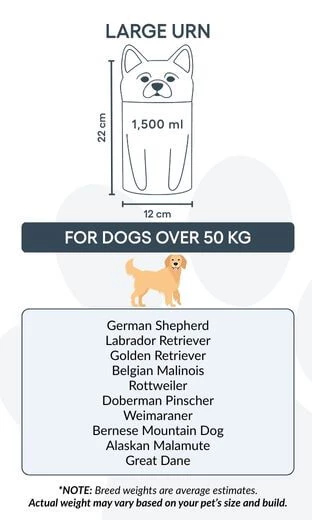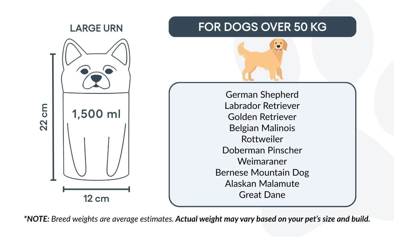 Available in three sizes for breeds up to 50 kg, this personalised dog urn offers space for custom text and is ideal for cremation ashes. The secure, sculpted form ensures safe storage and a timeless look for indoor display.