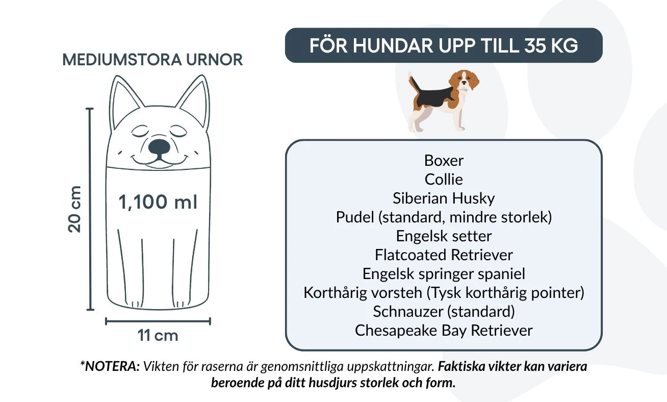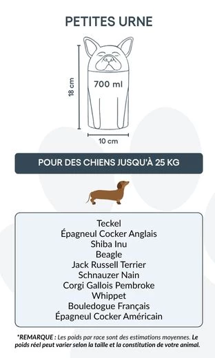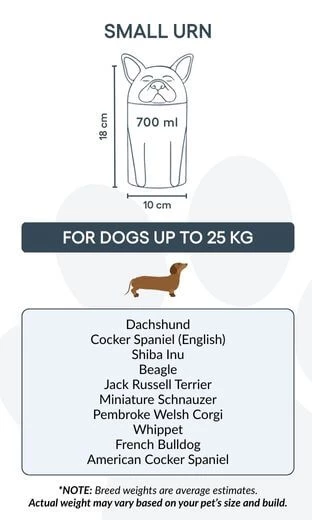 Note: Volume estimates are based on average pet cremation yields. Please consider your pet’s weight and build when choosing an urn.