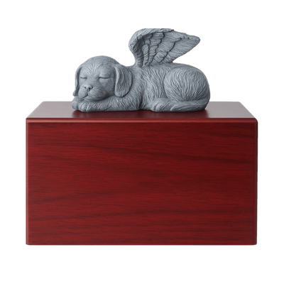 Crafted from rich red wood, the urn is topped with a beautifully detailed resin angel dog statue, symbolising peace and eternal love. The front panel includes a space for your favourite photo and a paw-print design beside the personalised tribute, making this an ideal dog memorial to display at home.