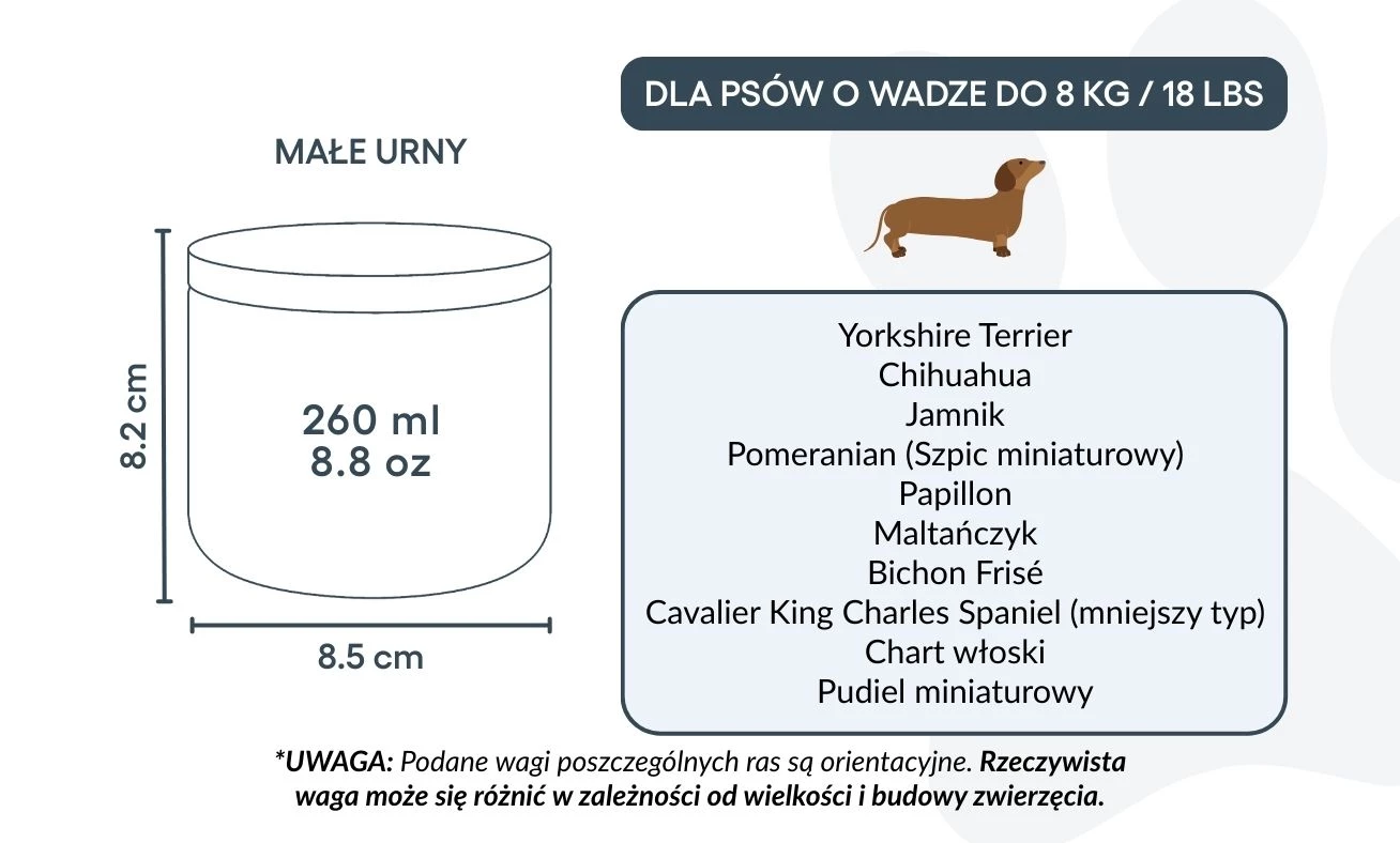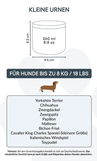 Small: 8.5 cm (W) x 8.2 cm (H) x 8.5 cm (L) | 260ml / 8.8oz |for dogs up to 8kg / 18lbs