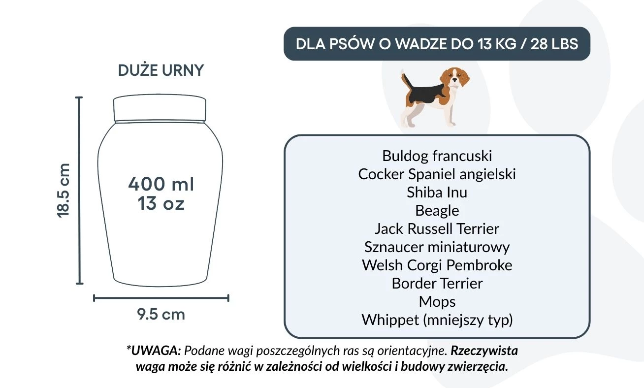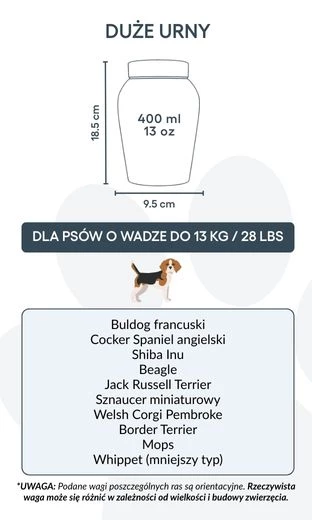 Large: 9.5 cm (W) x 18.5 cm (H) x 9.5 cm (L) | 400 ml / 13 oz – suitable for dogs up to 13 kg / 28 lbs