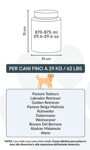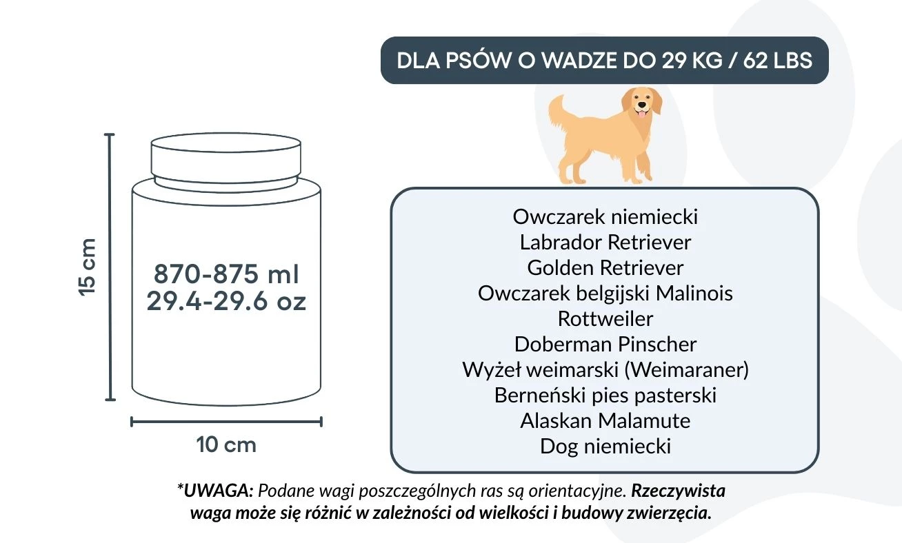 Small: 10 cm (W) x 15 cm (H) x 10 cm (L) | 870–875 ml / 29.4-29.6 oz - suitable for dogs up to approx. 29 kg / 62 lbs