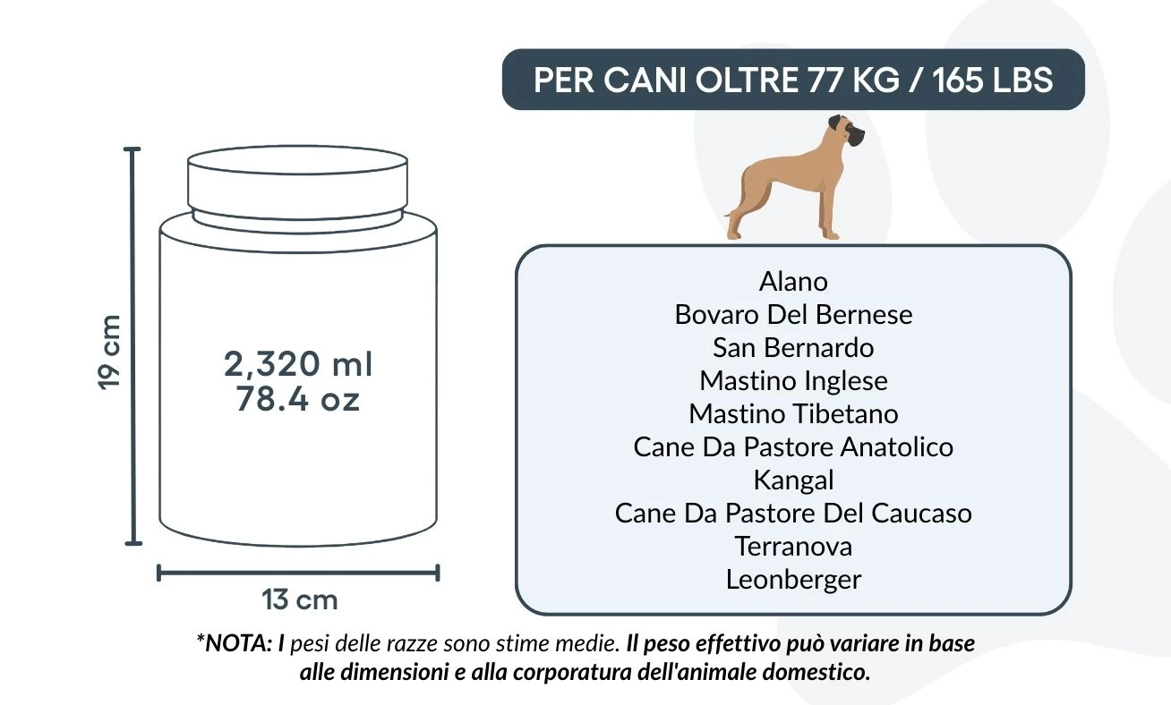 Large: 13 cm (W) x 19 cm (H) x 13 cm (L) | ~2,320 ml / 78.4 oz – suitable for dogs up to approx. 77 kg / 165 lbs