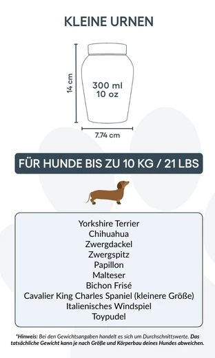 Small: 7.74 cm (W) x 14 cm (H) x 7.74 cm (L) | 300 ml / 10 oz – suitable for dogs up to 10 kg / 21 lbs